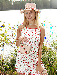 Hot girl with a perfect tanned body gets nude by the river and flashes her tits, ass and pussy