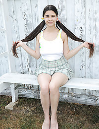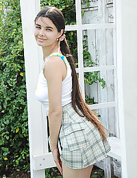 Pretty brunette gets nude and takes a shower in the garden exposing her wet tits and pussy