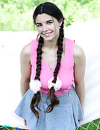 Gorgeous brunette with long braids, adorable tits and juicy pussy strips naked in a hammock